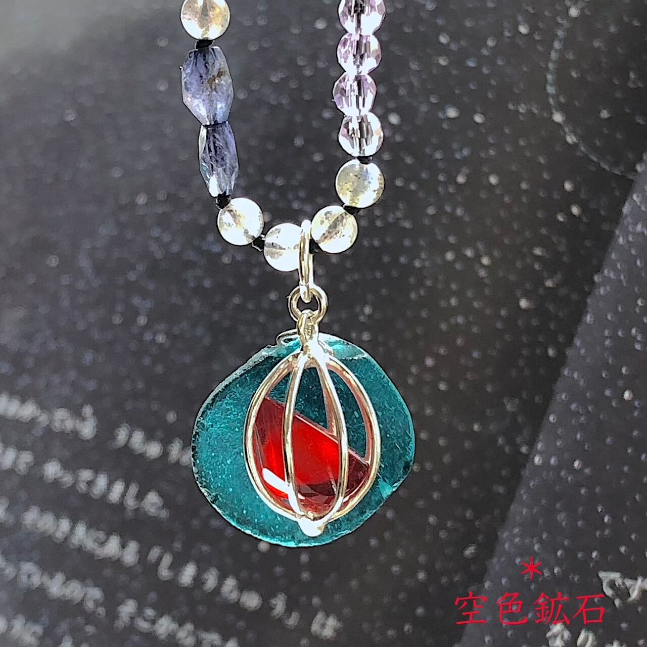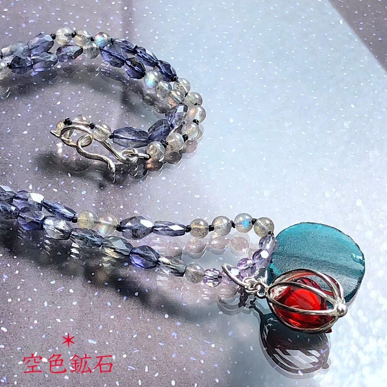 リンドウ色のアイオライトのビーズを紡いで夜空に見立てました。